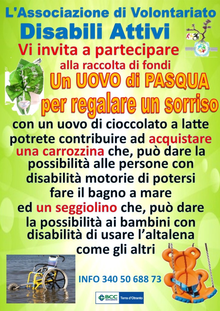 Quest’anno, l’Associazione di Volontariato Disabili Attivi, di cui sono rappresentate per la Provincia di Brindisi, promuove la raccolta fondi “Un uovo di Pasqua per regalare un Sorriso”.