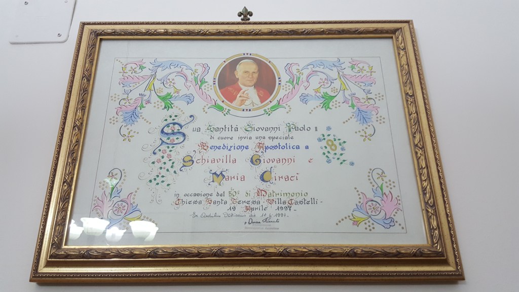 Entrambi si conoscevano da piccoli perché le famiglie si frequentavano, infatti Giovanni era solito chiamare col nomignolo “Sosò” Maria e la sorella di lui, nonchè amica della futura moglie. Cinque anni di differenza hanno tra loro. Il Signor Schiavilla partì in guerra nel 1940 durante la seconda guerra mondiale, a soli 20 anni, ma era innamorato della Signora Maria. Rimase fino al 1946 attraversando vari stati come: Grecia, Estonia, Russia e per tutto questo tempo fu dato per disperso e per questo motivo il fratello Don Raffaele Schiavilla, parroco del paese in quegli anni celebrò delle Messe perché dato per morto ma miracolosamente tornò a Villa Castelli sano e salvo. Prima di partire i due giovani si scambiarono delle foto con i loro ritratti.