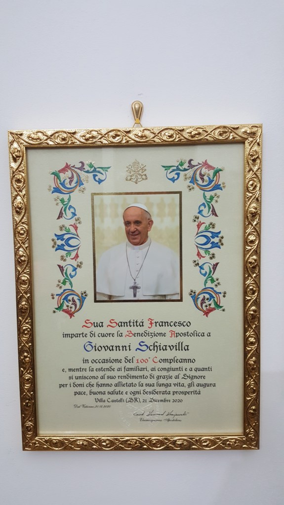 La coppia nel corso degli anni ha ricevuto due benedizioni da due pontefici diversi. Una il giorno stesso del matrimonio da parte di Papa Pio XII e l’altra nel giorno del loro 50° anniversario di matrimonio il 19 aprile 1997 da parte di Papa Giovanni Paolo II. Il Signor Schiavilla ha anche ricevuto la benedizione da parte di Papa Francesco, il 21 dicembre 2020 in occasione del suo 100° compleanno.