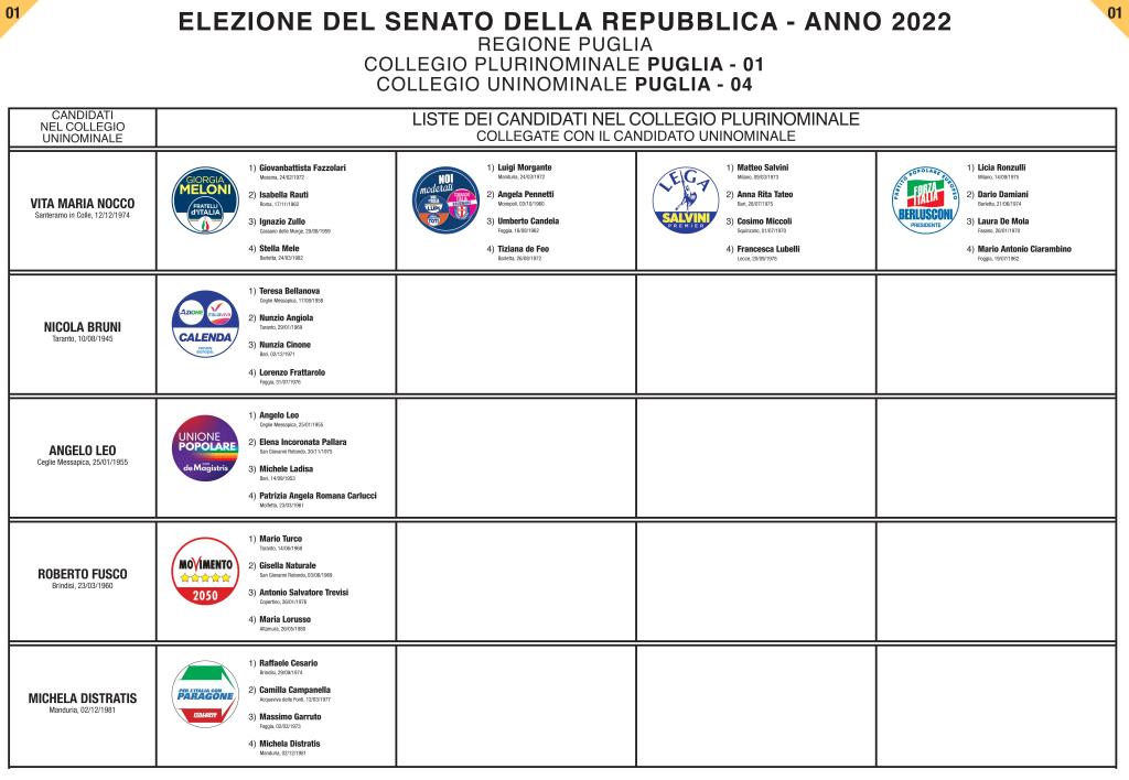 Questa invece è la lista dei candidati al Senato della Repubblica a cui i cittadini di Villa Castelli possono affidare il proprio voto:
