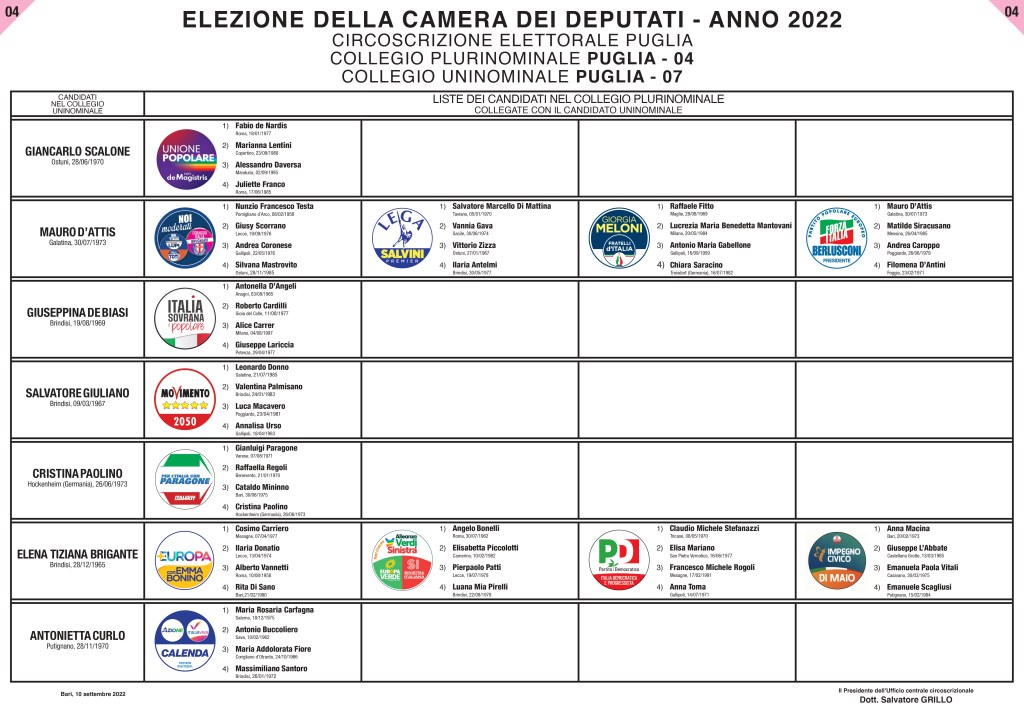 Ecco qui la lista dei candidati alla Camera dei Deputati a cui i cittadini di Villa Castelli possono votare: