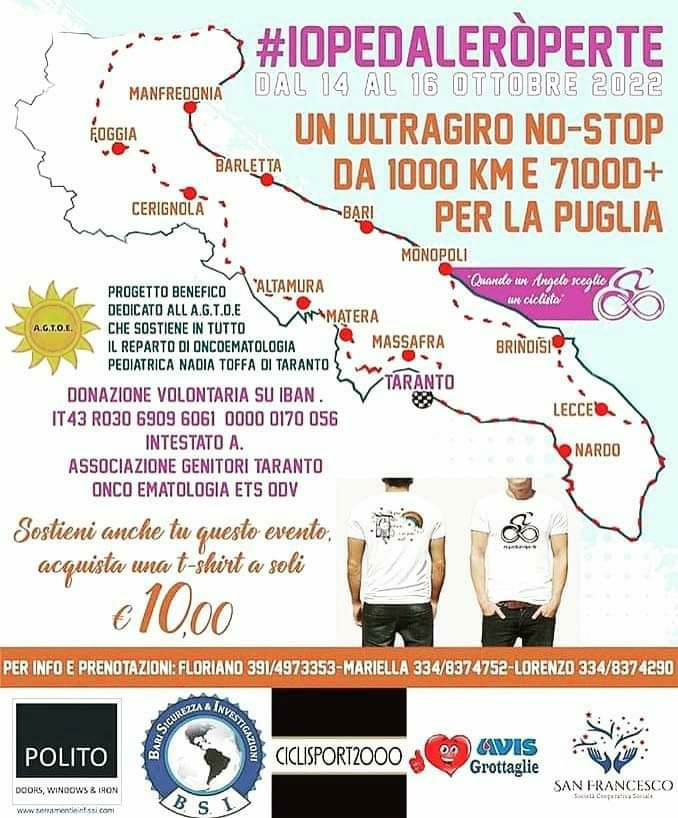 Per informazioni su come contribuire all’iniziativa e tutte le info sull’evento basterà cercare su Facebook la pagina “iopedaleròperte” e la pagina “Associazione Genitori di Taranto Onco-ematologia”.