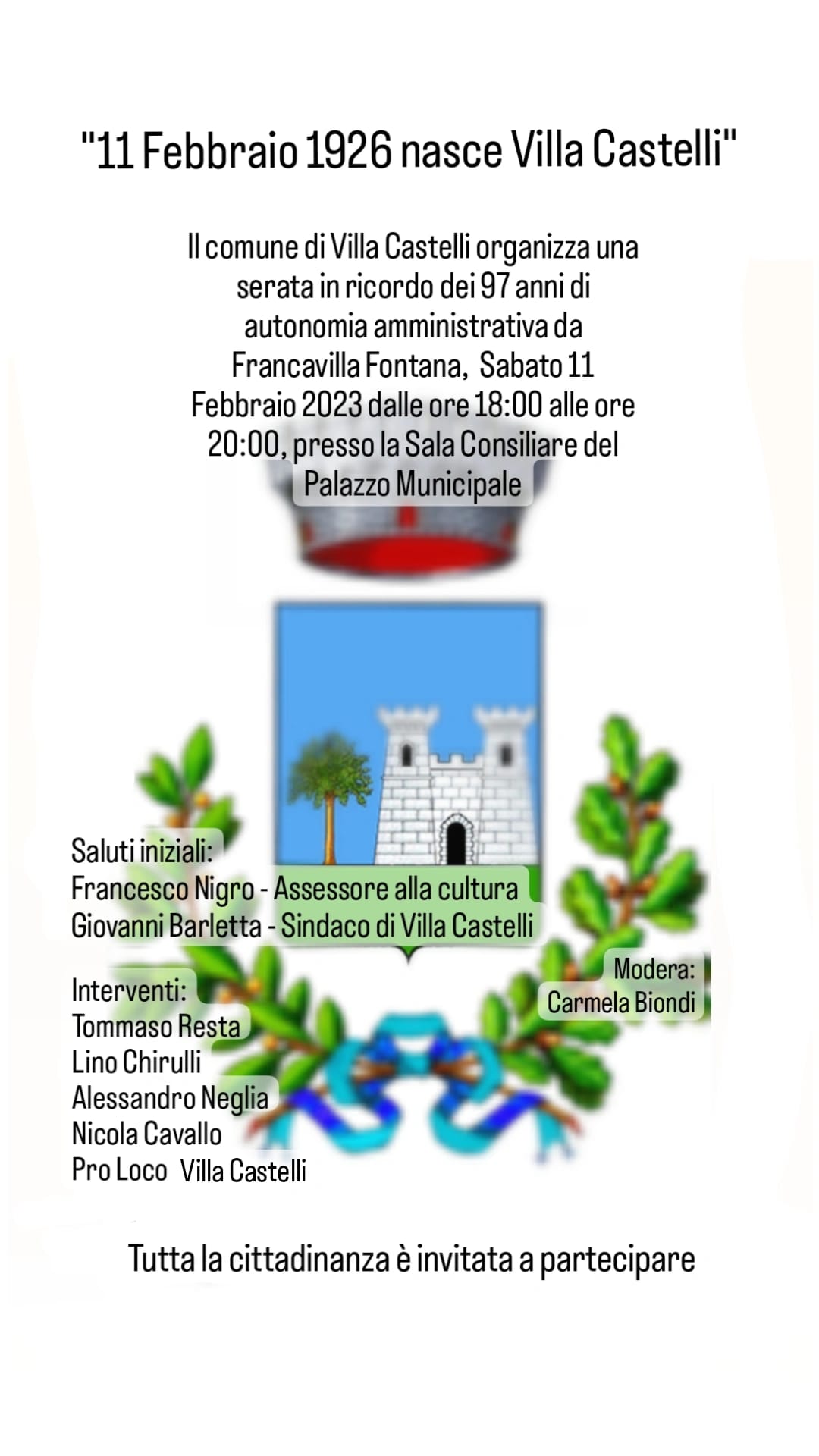 Sabato 11Febbraio 2023 alle ore 18:00 presso la Sala Consiliare del Palazzo Municipale, il Comune di Villa Castelli organizza una serata in ricordo dei 97 anni di Autonomia Amministrativa da Francavilla Fontana.