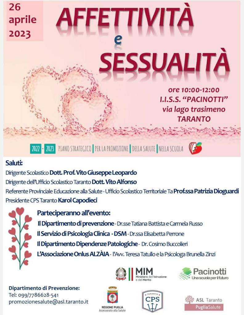 Il 26-04-2023 si è svolto al Pacinotti di Taranto il seminario promosso dalla Consulta Provinciale degli Studenti di Taranto assieme all’Asl di Taranto dal titolo: Affettività e Sessualità nell’era di Internet. Al centro della discussione l’educazione sessuale. A scuola bisognerebbe parlare di quanto accade nel mondo e negli studenti. Studenti che in questo periodo non stanno bene. Sempre più ragazzi chiedono comprensione sulle loro fragilità l’esempio calzante è la lettera parte del Breschè di Milano, alla sottoscrizione di questa lettera sono presenti due scuole di Taranto: Battaglini e Ferraris. La scuola non sta facendo ciò che dovrebbe fare: creare una società pensante.