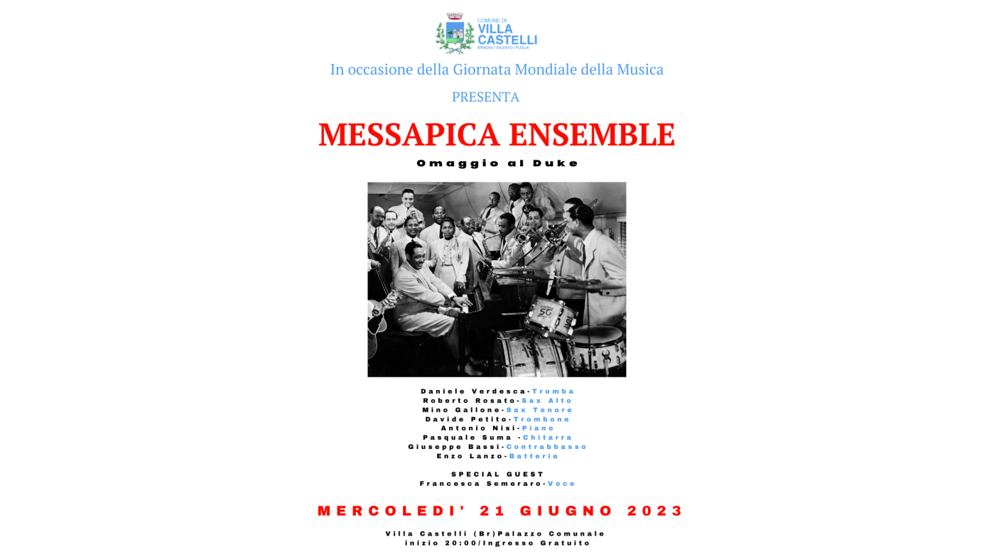 In occasione della Giornata Mondiale della Musica, Il Comune di Villa Castelli presenta: Messapica Ensamble. Un insieme di elementi che renderanno omaggio a Duke Ellington direttore d’orchestra, compositore e pianista statunitense.