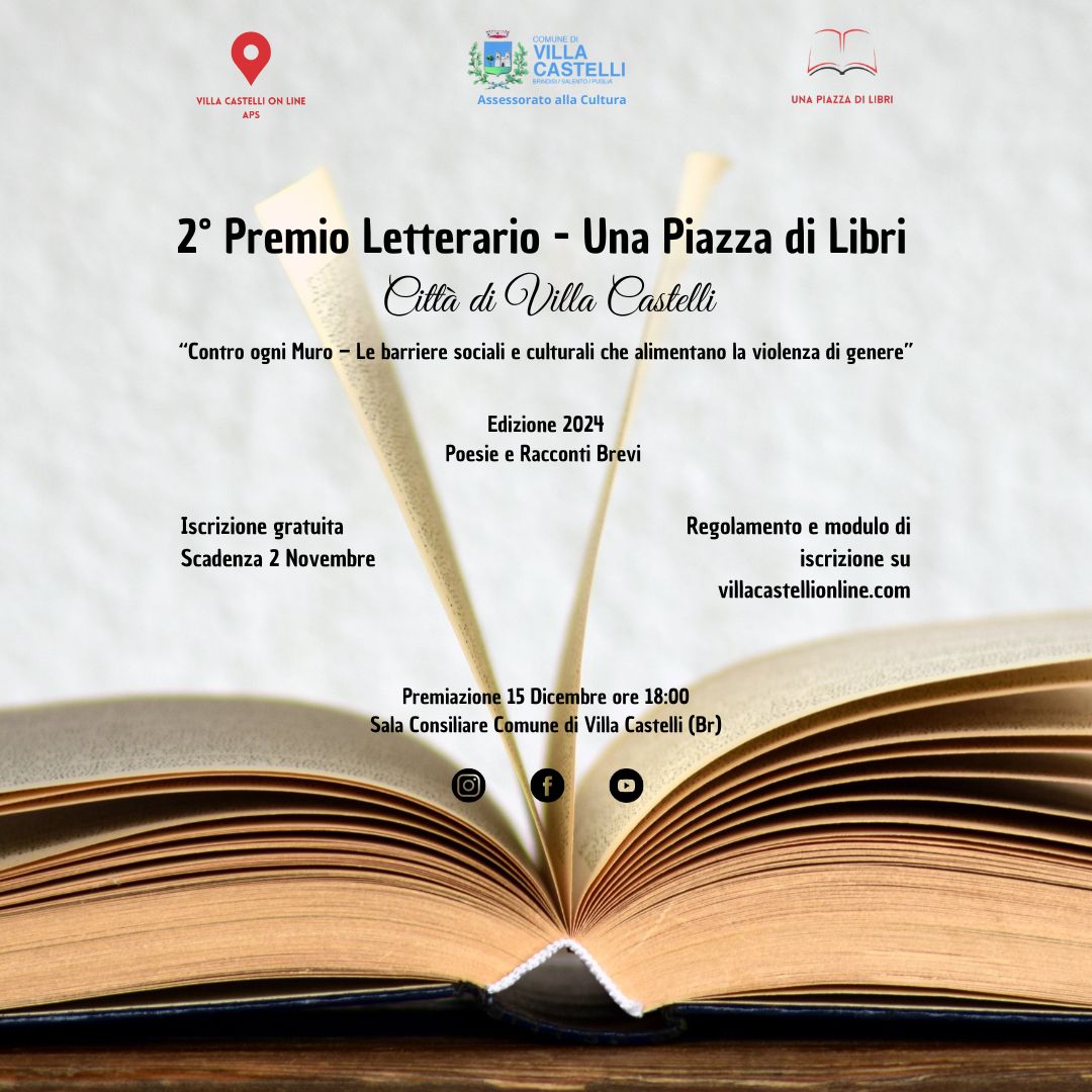 LโAssociazione di Promozione Sociale Villa Castelli On Line Aps, con il prezioso sostegno del Comune di Villa Castelli, รจ lieta di presentare la seconda edizione del Premio Letterario โUna Piazza di Libriโ Cittร di Villa Castelli.