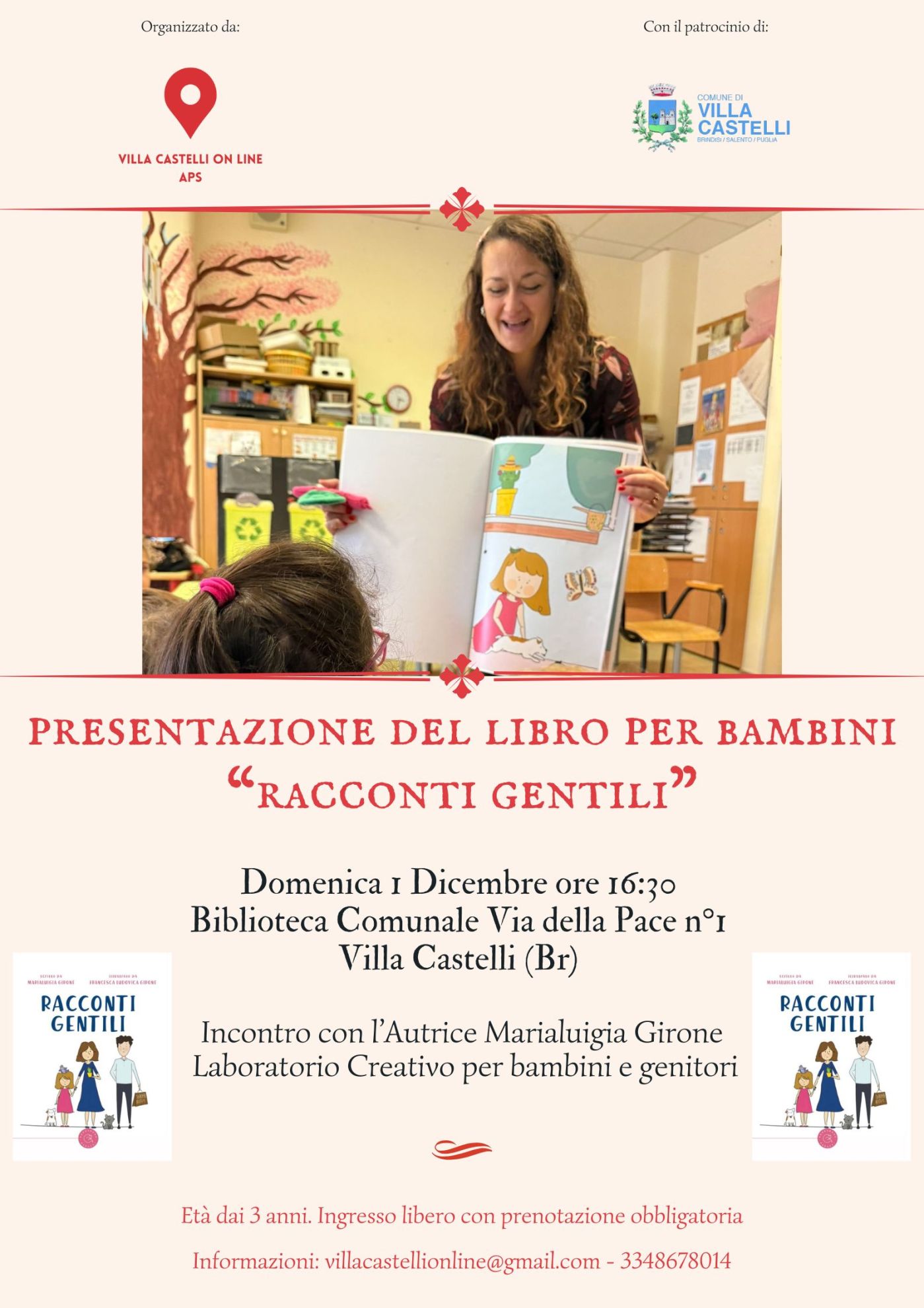 Domenica 1 Dicembre alle ore 16:30, presso la Biblioteca Comunale in Via della Pace N° 1 a Villa Castelli (Br), si terrà la presentazione del libro per bambini Racconti Gentili, scritto da Marialuigia Girone e illustrato da Francesca Ludovica Girone.