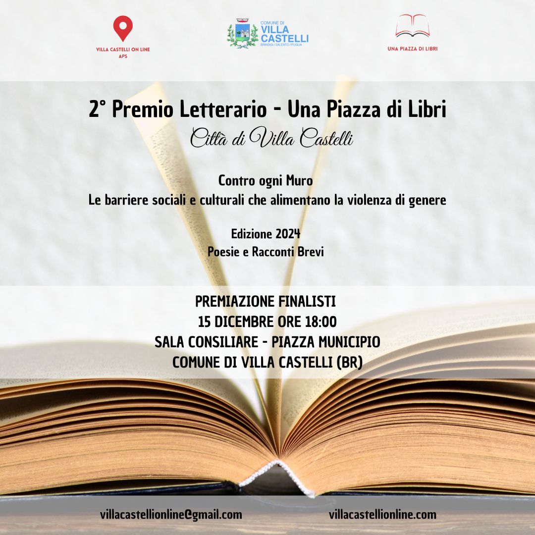 Domenica 15 dicembre, alle ore 18:00, presso la Sala Consiliare del Comune di Villa Castelli (BR), si terrà la cerimonia di premiazione del 2° Premio Letterario “Una Piazza di Libri” – Città di Villa Castelli. Dedicata al tema “Contro ogni Muro – Le barriere sociali e culturali che alimentano la violenza di genere”, la manifestazione rappresenta un importante momento di riflessione e confronto sulla violenza di genere, attraverso il potere della parola e dell’arte.
