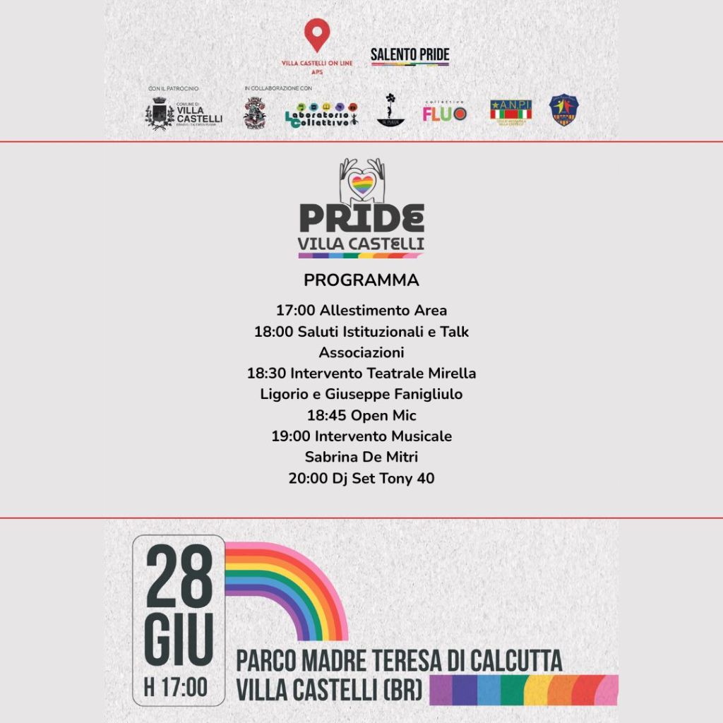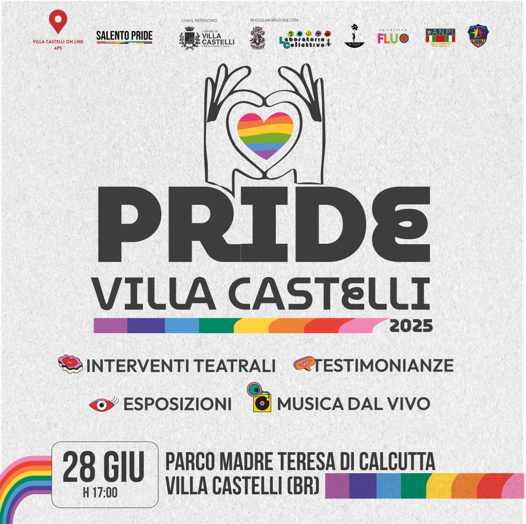 Villa Castelli (BR) – La comunità di Villa Castelli è pronta a tingersi dei colori dell’arcobaleno per la seconda edizione del Villa Castelli Pride 2025, un evento dedicato alla celebrazione e alla rivendicazione dei diritti. L’appuntamento è fissato per sabato prossimo, 28 giugno, alle ore 17:00 presso Parco Madre Teresa di Calcutta. L’ingresso è libero e gratuito.