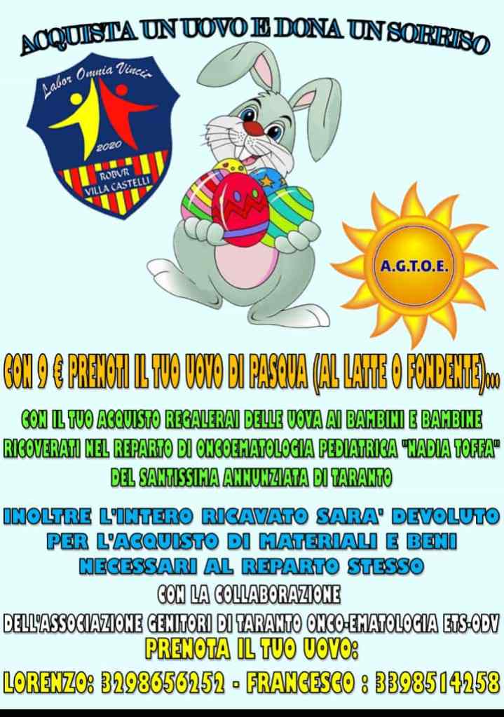 Riceviamo e pubblichiamo il comunicato della Asd Robur Villa Castelli che insieme all’ Associazione Genitori di Taranto Onco-Ematologia promuovono la raccolta fondi per i bambini ricoverati nel reparto di Oncoematologia Pediatrica “Nadia Toffa” dell’ospedale Santissima Annunziata di Taranto.