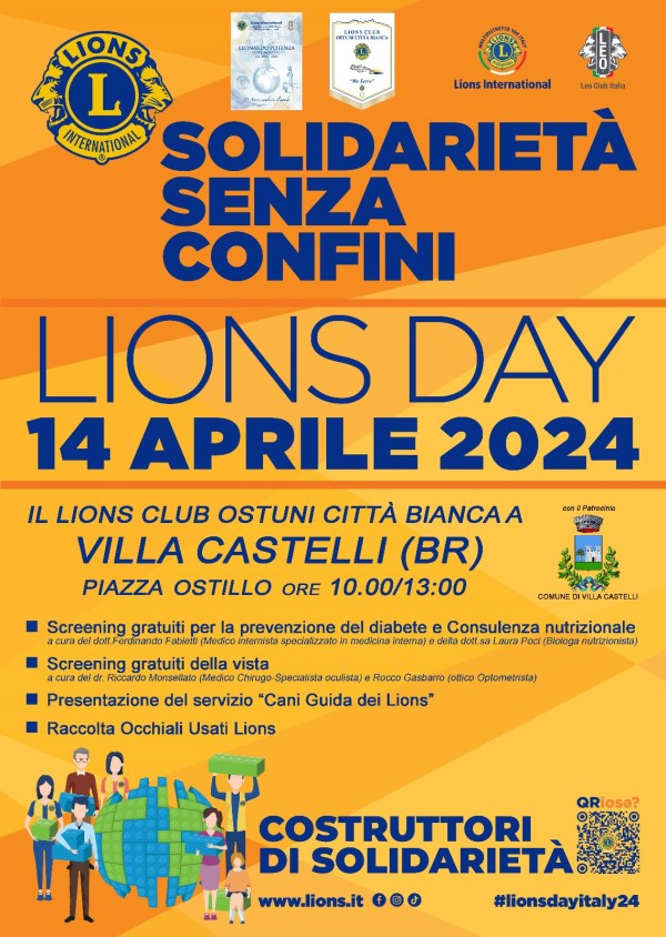 Domenica 14 aprile 2024 in Piazza Ostillio, a Villa Castelli, la Giornata Nazionale dei Lions all’insegna della Solidarietà.