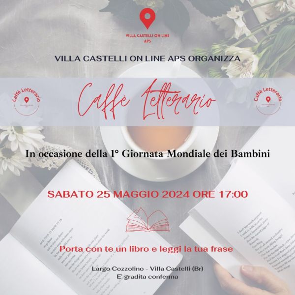 L'Associazione di Promozione Sociale Villa Castelli On Line Aps è lieta di annunciare un nuovo appuntamento con il "Caffè Letterario", che si terrà il 25 maggio 2024 alle ore 17:00 presso Largo Cozzolino a Villa Castelli (BR). Questo evento speciale sarà dedicato alla Prima Giornata Mondiale dei Bambini, un'iniziativa promossa da Papa Francesco. Un Evento... Continua a leggere →