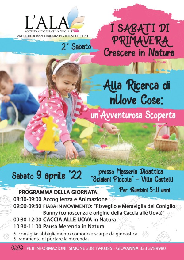 Condividiamo la programmazione del secondo Sabato di Primavera organizzato dalla Società Cooperativa Sociale L'Ala che si terrà Sabato 9 Aprile dalle 8:30 alle 12:00 presso Masseria Sciaiani Piccola per bambini di età compresa dai 5 agli 11 anni. "Una caccia alle uova immersi nella natura! Stimolante, educativa, coinvolgente, un modo per allietare la Pasqua dei... Continua a leggere →