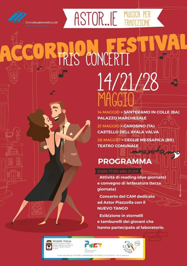 L'Associazione di Promozione Sociale CAM - Centro Accademico Musicale di Villa Castelli (Br), nell'ambito del progetto "Astor...ie: Musica per Tradizione" propone un tris di eventi che si svolgeranno il 14, 21 e 28 Maggio dalle 17:30 alle 21:00, rispettivamente nelle città di Santeramo in Colle (Ba) presso Palazzo Marchesale, Carosino (Ta) presso Castello dell'Ayala e... Continua a leggere →